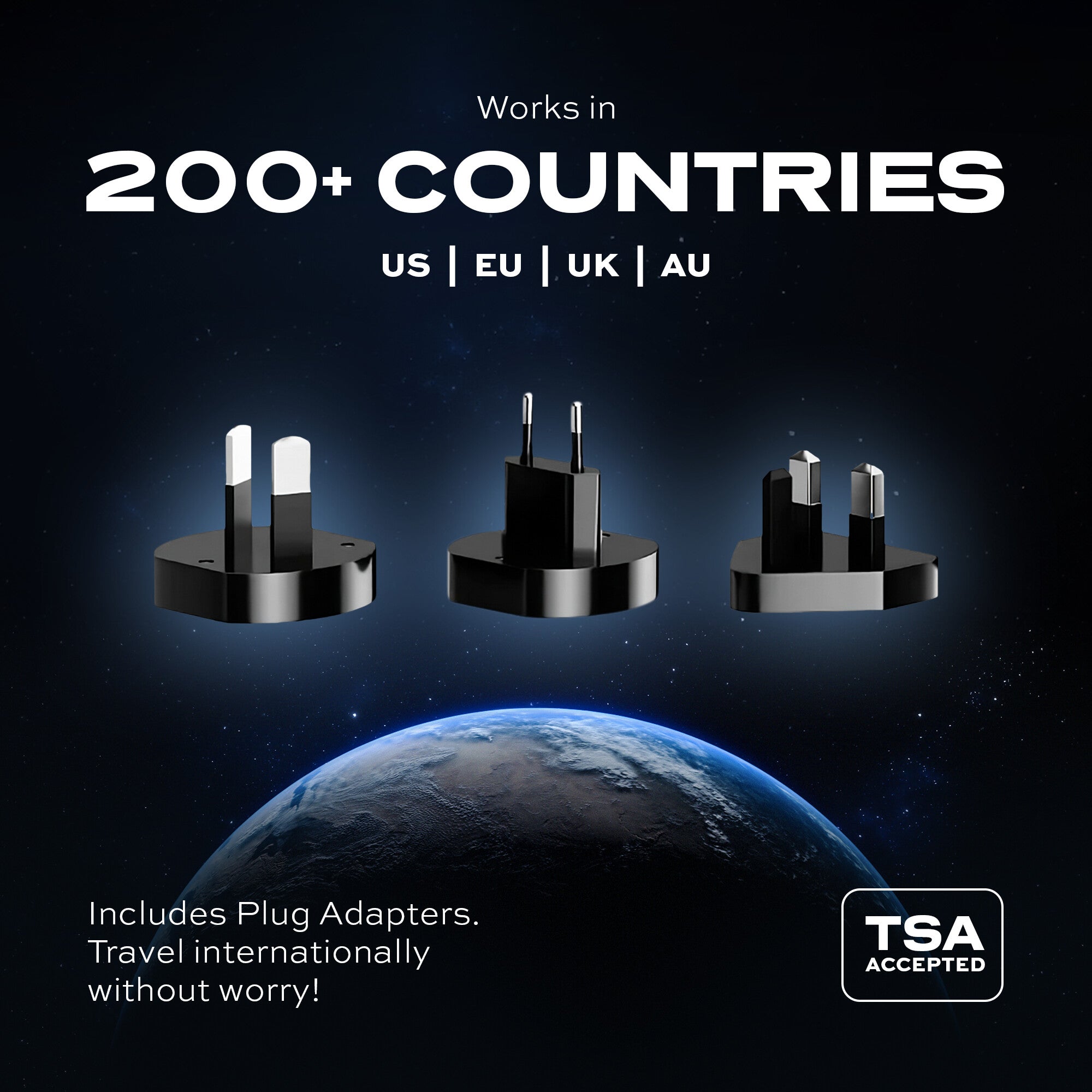Works in 150 Countries. 3 travel adapters included with the SmartCharge allow you to charge up in over 150 countries worldwide.
